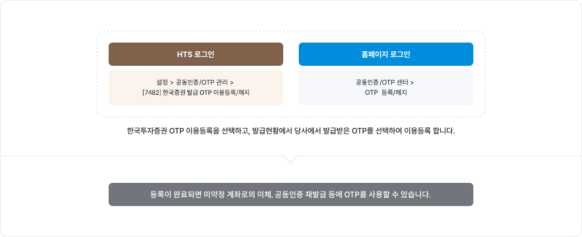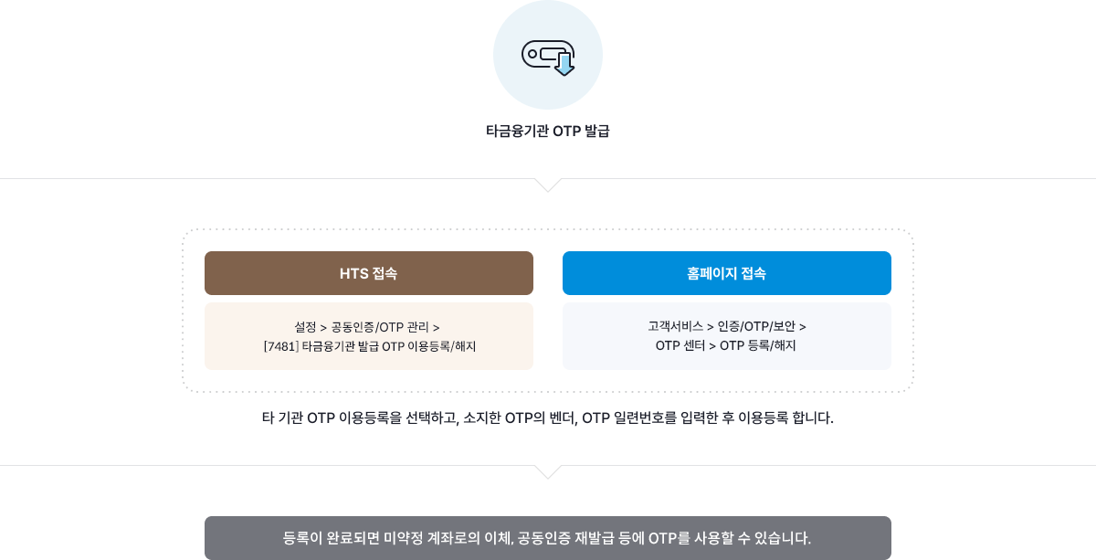 • OTP통합인증센터에 참가하고 있는 금융기관 중 한국투자증권을 제외한 금융기관에서 OTP를 발급받은 후 그 발급받은 OTP를 한국투자증권의 HTS, 홈페이지 거래 등에 활용하고자 한국투자증권에 등록하는 것을 말합니다.