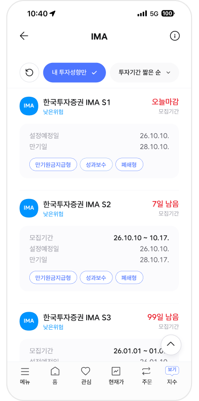 • IMA는 당사(AA, 2025.10.22, 한국기업평가)의 신용위험(부도, 파산 등)에 따른 투자원금의 전부 또는 일부 손실이 발생할 수 있습니다. 다만, 이 경우에도 IMA 운용자산을 자기신탁을 통해 구분관리하므로 운용자산 매각 및 청산을 통해 고객의 투자원금을 우선적으로 변제 받을 수 있습니다.